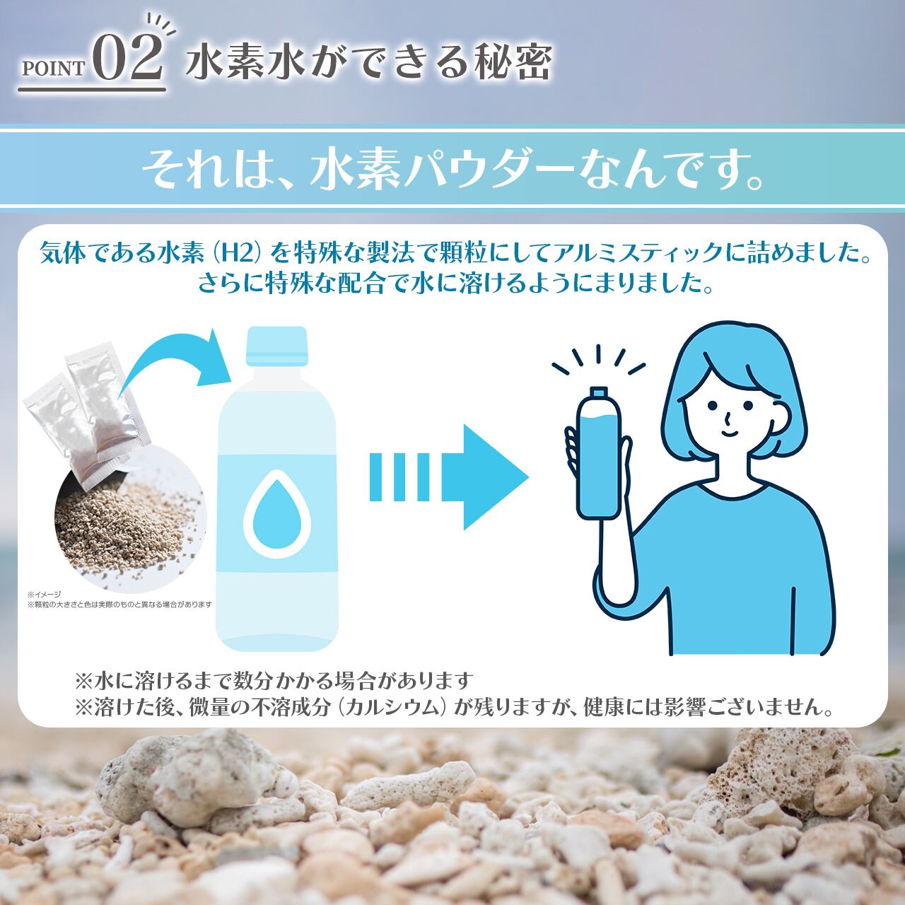 ・「どこでも水素水 〜Hydrogen stick〜」は、水に溶かすだけで簡単に高濃度水素水を作れるスティック型商品です。